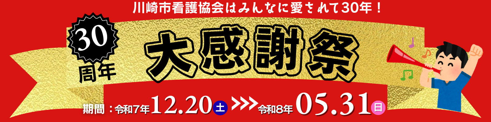 今回は30周年に先駆けて看護協会会員様に向けて「川崎市看護協会30周年ありがとう感謝祭」を実施いたします!